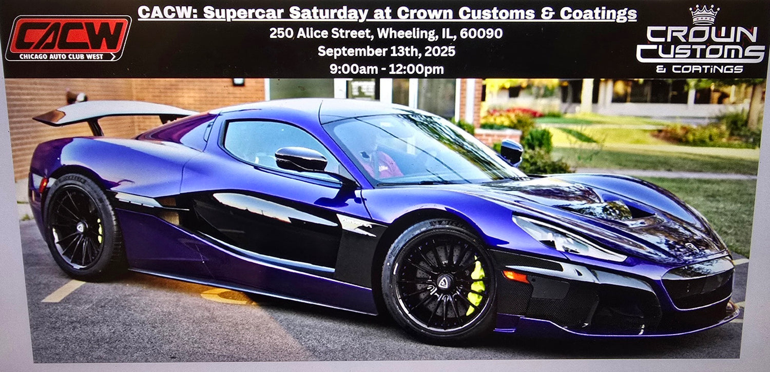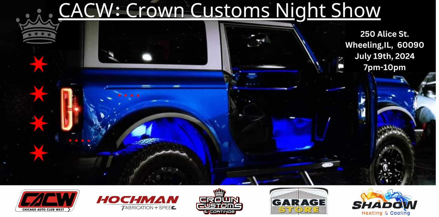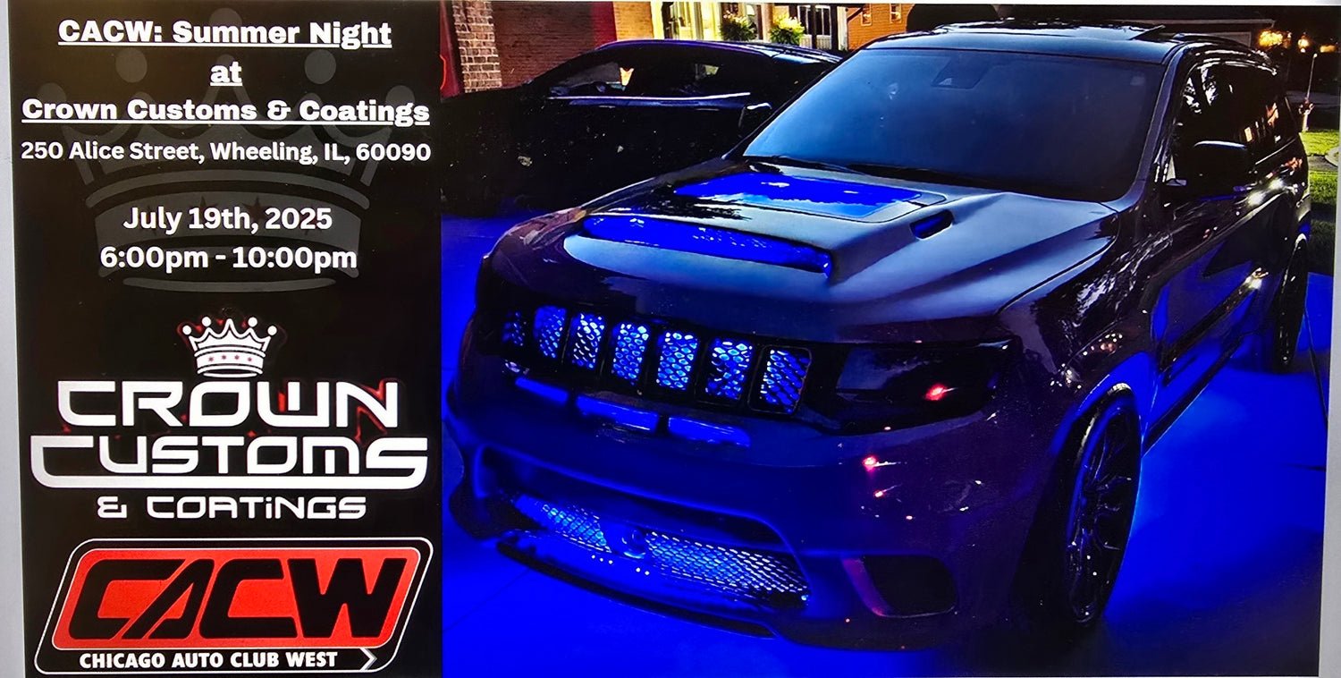 Come join Chicago Auto Club West and partnering sponsors at Crown Customs. ALL MAKES AND MODEL WELOCOME!Be sure to bring the entire family! Come enjoy some of the best cars in Chicagoland with other like-minded car enthusiasts.Please respect our property and considerate neighbors throughout the event. We urge attendees to refrain from burnouts and excessive revving and strictly abide by all traffic laws. Let's come together and ensure a unified experience for all involved.