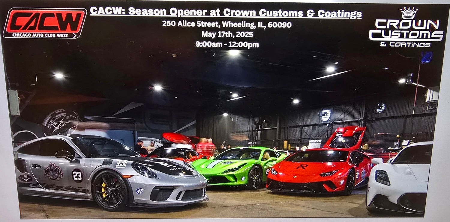 Come join Chicago Auto Club West and partnering sponsors at Crown Customs. ALL MAKES AND MODEL WELOCOME! Be sure to bring the entire family! Come enjoy some of the best cars in Chicagoland with other like-minded car enthusiasts.Please respect our property and considerate neighbors throughout the event. We urge attendees to refrain from burnouts and excessive revving and strictly abide by all traffic laws. Let's come together and ensure a unified experience for all involved.